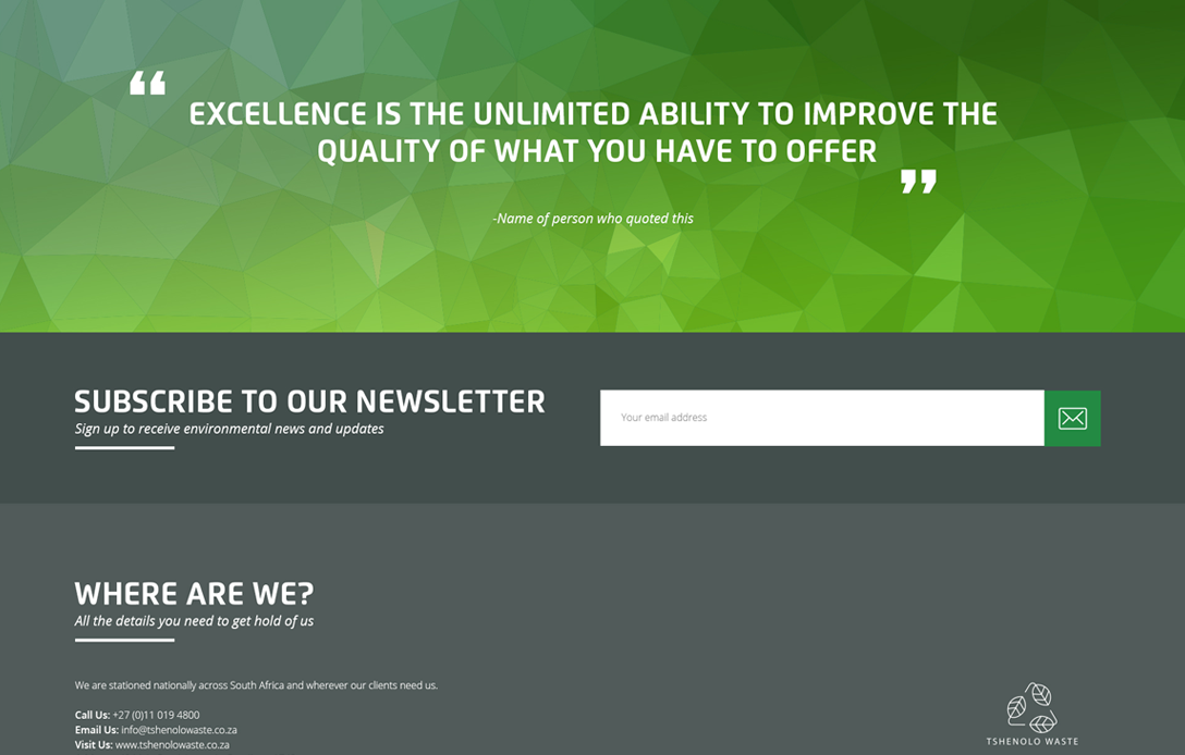 The only thing we don’t recycle at Bluewire is our ideas – they only get used once! Everything else gets recycled, repurposed or reduced to help reduce our impact on the environment. So we were delighted to have the opportunity to create a new, eco-friendly website for Tshenolo Waste, a company that’s committed to cleaning up South Africa and empowering local communities at the same time. A strong yet gentle green colour palette and repeated organic forms allow the final website design to support Tshenolo Waste’s mission to provide customer- and planet-friendly waste management services.